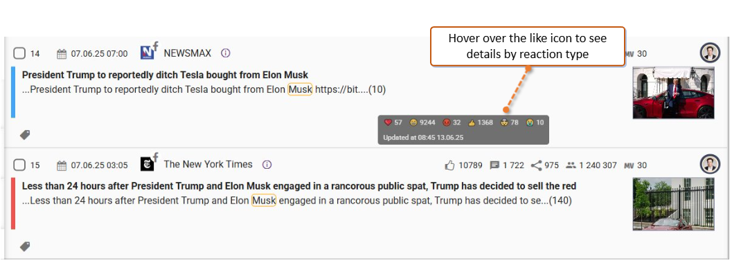 On the publication card in the news feed for Facebook and Telegram, the total sum of all reactions is displayed; for other social networks – likes only. Hover over the like icon on the publication card to see the breakdown of reactions across the 9 types.