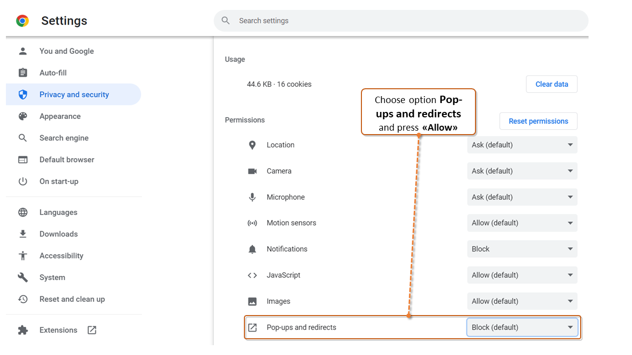 Select the "Allow" option in the Pop-ups and redirects section. Then return to the Semantrum window. The browser will ask you to reload the page, do this and after reloading you will receive notifications of new publications while you are in the system.