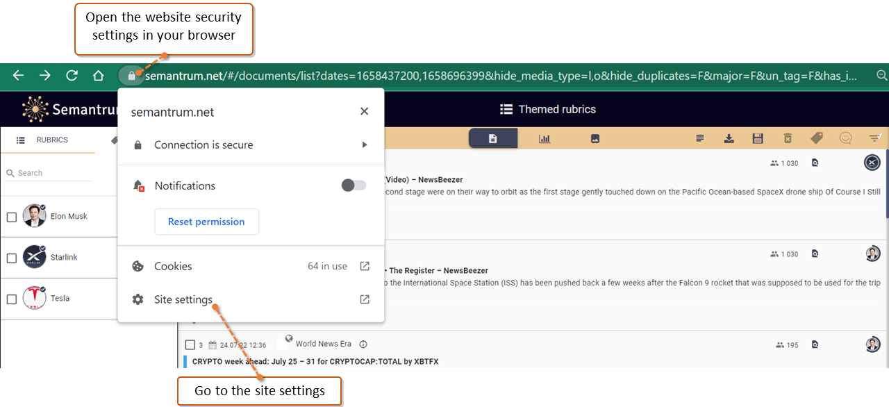 To receive pop-up notifications when new publications appear, you need to allow your browser to send you such notifications from Semantrum. You can do this when the system first tries to send you a notification or later in your browser's site permissions settings.