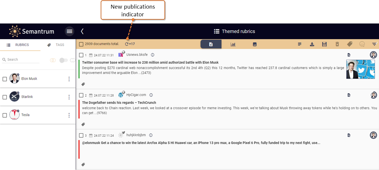 If you have been working with one topic or filter set for a long time, or if you have just leave the system page opened in your browser, the system will inform you of the appearance of new publications. On the left side of the publication panel an indicator of the number of new publications appears.