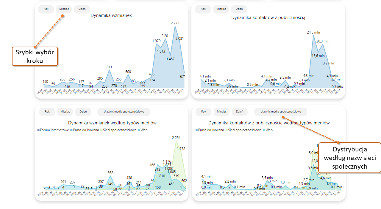 Teraz wystarczy jeden szybki rzut oka na pierwszą stronę dashboardu, aby zrozumieć obraz dnia. Główne metryki w dynamice w porównaniu do poprzedniego okresu pozwolą zrozumieć istniejące czynniki ryzyka czy popularność wybranego tematu w mediach.