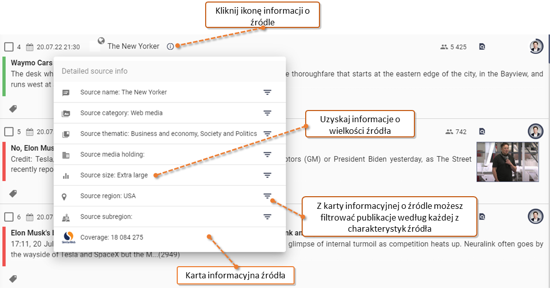 Możesz wybrać wiele wartości na filtrze, a także zanegować niektóre wartości. Na przykład możesz wybrać jednocześnie bardzo duże i duże źródła. W ten sposób otrzymasz wszystkie posty ze źródeł oznaczonych jako bardzo duże lub jako duże.