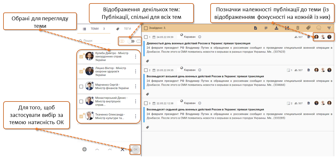 Якщо публікації, які потрібно видалити, належать декільком темам та їх потрібно видалити із всіх цих тем, потрібно провести масове видалення публікацій під час роботи з усіма потрібними темами. Дізнайтесь більше про перегляд тем. Щоб працювати у декількох темах одночасно оберіть потрібні теми чекбоксами біля їх назв та натиність ОК під списком тем.