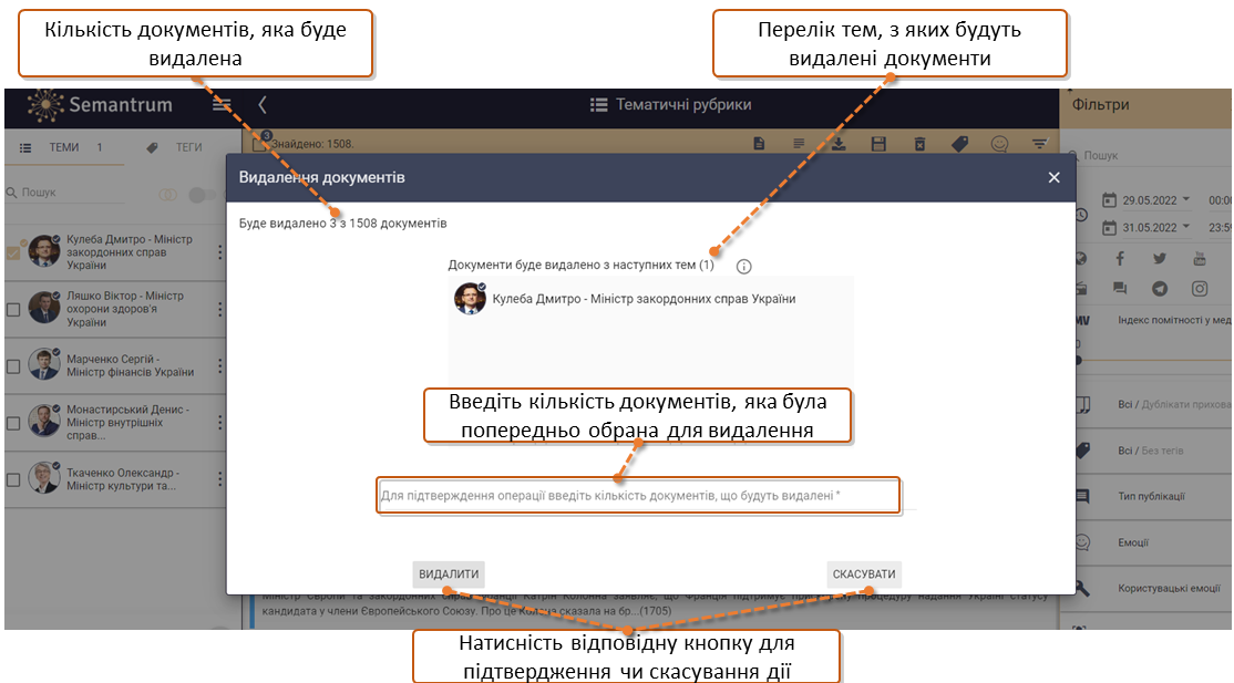 В системі Semantrum користувачі мають можливість видаляти окремо вибрані документи або масив даних з теми/тем. Для того, щоб видалити документ, відкрийте його. У правій панелі вказано, до яких тем потрапила дана публікація. Якщо ви знаходитесь у ...